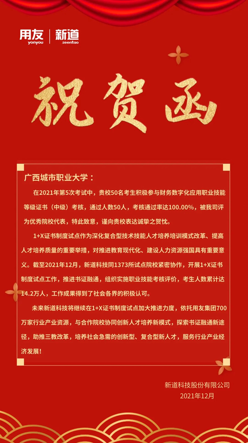 为深化复合型技术技能人才培养培训模式改革,提高人才培养质量,12月5日,商学院与新道科技成功举办了1+X财务数字化应用职业技能等级证书(中级)2021年第五次全国统一考试,参考50名学生全部通过考试,考核通过率高达100%,新道科技股份有限公司向我院发来祝贺函。