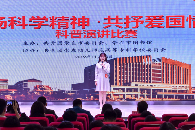 为推动“创新、绿色、开放、共享”的发展理念深入人心,激发广大青年创新意识,积极投身科学实践,11月13日,由共青团崇左市委员会举办的崇左市大学生“弘扬科学精神,共抒爱国情怀”科普演讲比赛在崇左幼儿师范高等专科学校举行,共有包括我校在内的崇左市5所高校,15名参赛选手参加。