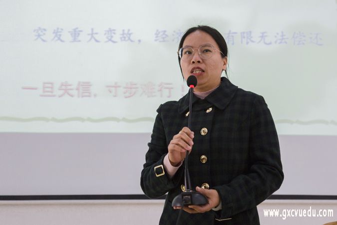 讲座最后,由我校学工部(处)副处长柳英成老师作总结,她表示,希望同学们能够牢记诚信的重要性和重要意义,重视个人征信,防范不良网贷,恪守契约精神,做诚实守信的新时代大学生,诚信贷款,诚信做人、诚信做事。