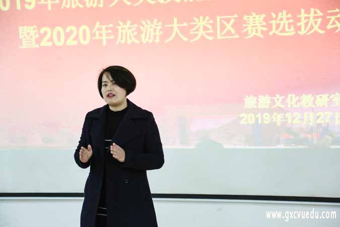 为促进各专业的创新发展,提高同学们的应用技能水平,贯彻落实学校"三爱、三学、三争"教育活动理念,12月27日下午,管理学院、外语系(以下简称:管外学院)在我校空港校区维新楼阶梯七教室举行2019年旅游大类技能大赛表彰大会暨2020年旅游大类区赛选拔动员会。管外学院党总支副书记谢金媚、教务办主任冉转玲、旅游文化教研室专业教师梁秋萍、烹调工艺与营养专业教师严学迎、胡杆等领导老师出席本次大会。旅游、烹调工艺与营养等专业18、19级学生代表参加了本次大会。