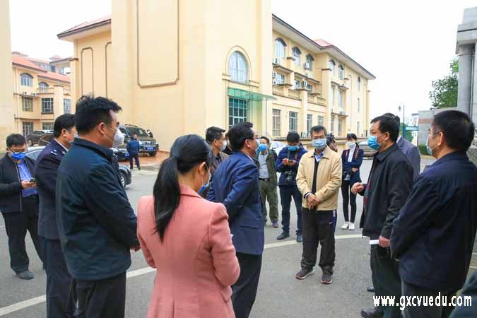 领导们就学校防控工作、开学预案等进行了探讨。崇左市委常委、政法委书记陶辉一行对我校疫情防控工作表示充分肯定。