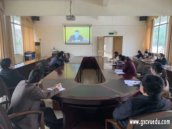 3月20日上午,2020年教育工作电视电话工作会议在自治区教育厅召开。自治区党委教育工委书记、教育厅厅长唐咸仅在主会场出席会议并作年度工作报告。会议由自治区教育厅党委组副书记、副厅长、一级巡视员黄雄彪主持。我校在空港校区旧行政楼三楼设分会场。学校校长李中华、党委书记伍鹏志、副书记周义文、常务副校长邓肖丽、副校长黄妙红、罗梅等有关部门领导参会。