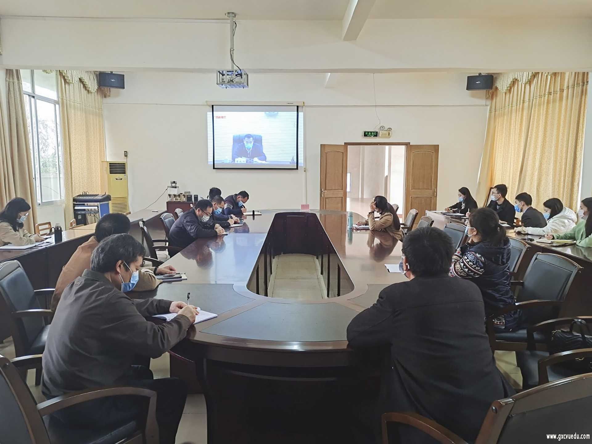 4月2日下午,全区教育系统学校开学准备工作视频调度会议在南宁召开。自治区防控指挥部、学校开学工作组组长、党委教育工委书记、教育厅厅长唐咸仅在主会场出席会议并讲话。会议由自治区教育厅党组副书记、副厅长、一级巡视员黄雄彪主持。我校在空港校区旧行政楼三楼设分会场。学校新冠肺炎疫情防控工作领导小组全体成员参会。