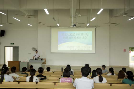 5月26日下午,在我校崇左校区阶梯三教室举行2020年崇左市雨露计划扶贫培训政策宣讲会。出席本次宣讲会的有崇左市扶贫办负责人邓海峰、扶贫办干部凌婵婷、崇左市学生资助管理中心莫小连三位领导。我校获得雨露计划补助的所有学生参加了此次宣讲会。