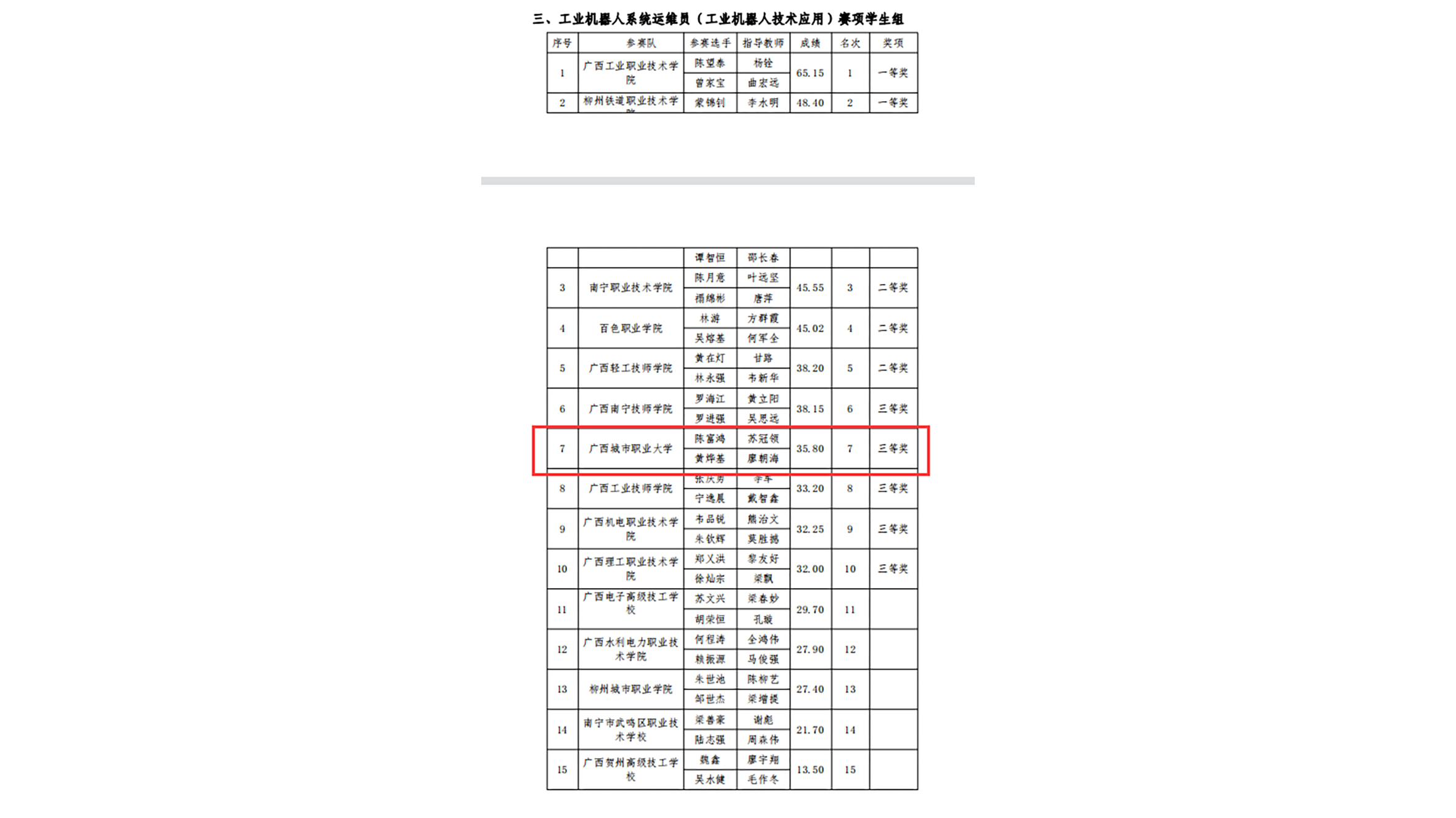 近日,由广西壮族自治区工业和信息化厅等5部门联合主办,广西工业职业技术学院承办的2021年全国工业和信息化技术技能大赛广西选拔赛获奖名单已揭晓,智能工程学院学子于工业机器人系统运维员(工业机器人技术应用)赛项中获得三等奖。
