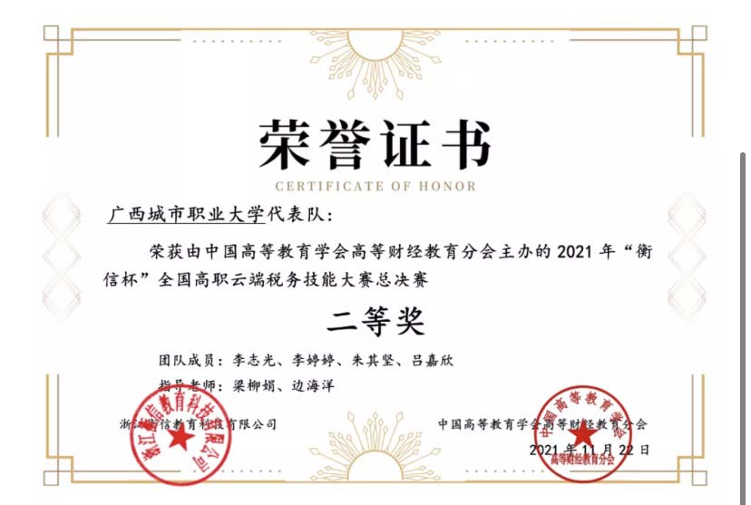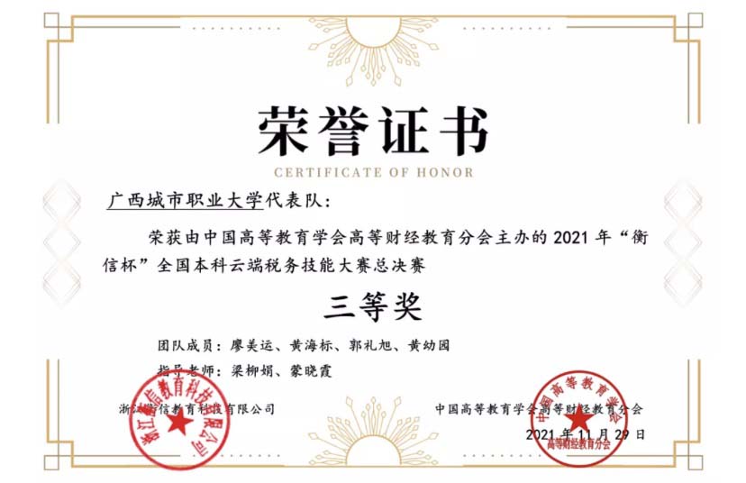 近日,由中国高等教育学会高等财经教育分会主办,浙江衡信教育科技有限公司提供技术支持的2021年“衡信杯”全国高职、本科云端税务技能大赛总决赛在线上成功举办。来自全国各省(直辖市)的高等院校共146支队伍展开激烈角逐,商学院财会专业代表队从大赛中脱颖而出,最终高职组李志龙、李婷婷、朱其坚、吕嘉欣荣获二等奖、本科组廖美运、黄海标、郭礼旭、黄幼园荣获三等奖。
