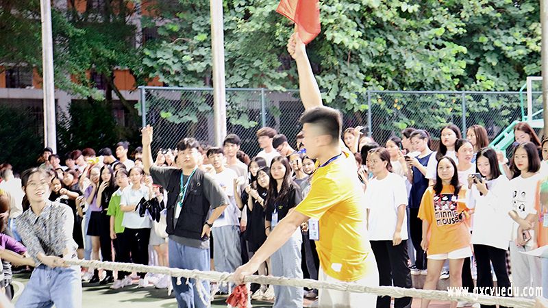 比赛哨声响起,队员们高呼着“一二,一二”,双手紧握长绳,拼尽全力往后拉,班主任们也跃跃欲试地站在一旁为学生们加油呐喊!班级内剩余的同学们自发组成啦啦队为本班人员加油。号子声、呐喊声此起彼伏,飘荡在整个球场上空。