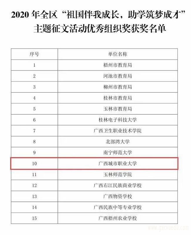 近日,根据《自治区教育厅关于公布2020年全区“祖国伴我成长,助学筑梦成才”主题征文活动获奖名单的通知》(桂教资助〔2020〕27号)文件精神,我校师生在此次征文活动中喜获佳绩,收获满满。经组织专家评审,高校组我校学子张宇萍作品《后盾》获一等奖;汪小筱作品《用“爱—学—争”守护初心,串联梦想》获二等奖、彭燕萍作品《我的“灯”亮了》获二等奖;我校教师李宁宁、赵春桃、黄艳飞获“优秀指导教师奖”;中职组我校附属中职院校学子廖佳燕作品《祖国伴我成长,助学筑梦成才》获三等奖;邓斯纭作品《感恩有你,一路同行》获优秀奖,教师梁月莉、羊双全获“优秀指导教师奖”。同时,根据参加活动单位的征文质量和组织特色,我校获高校组“优秀组织奖”。