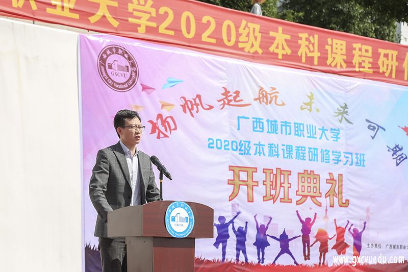 孙振保院长为崇左校区开班典礼致辞。他表示,我校作为全国首批、广西唯一的职业本科大学,是新时代职业教育改革的实践者和先行者,现共设有19个本科专业,一直都遵循“质量立校、人才强校、文化铸校、特色兴校”的办学思路,践行“明德、厚学、维新、笃行”校训精神。希望同学们在今后的学习生活中能不负学校领导和全体教师的殷切期望,刻苦专研,虚心好学,努力成为一名高素质高技能的大学生。
