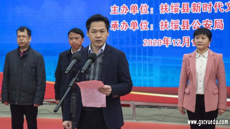 根据《崇左市公安机关集中宣传活动工作方案》要求,扶绥县公安机关于12月15日上午在扶绥县文化广场组织开展集中宣传活动。扶绥县县长黄建辉、扶绥县副县长谢耀勋等领导出席本次宣传活动。活动由扶绥县副县长谢耀勋主持,我校师生代表受邀参加活动。