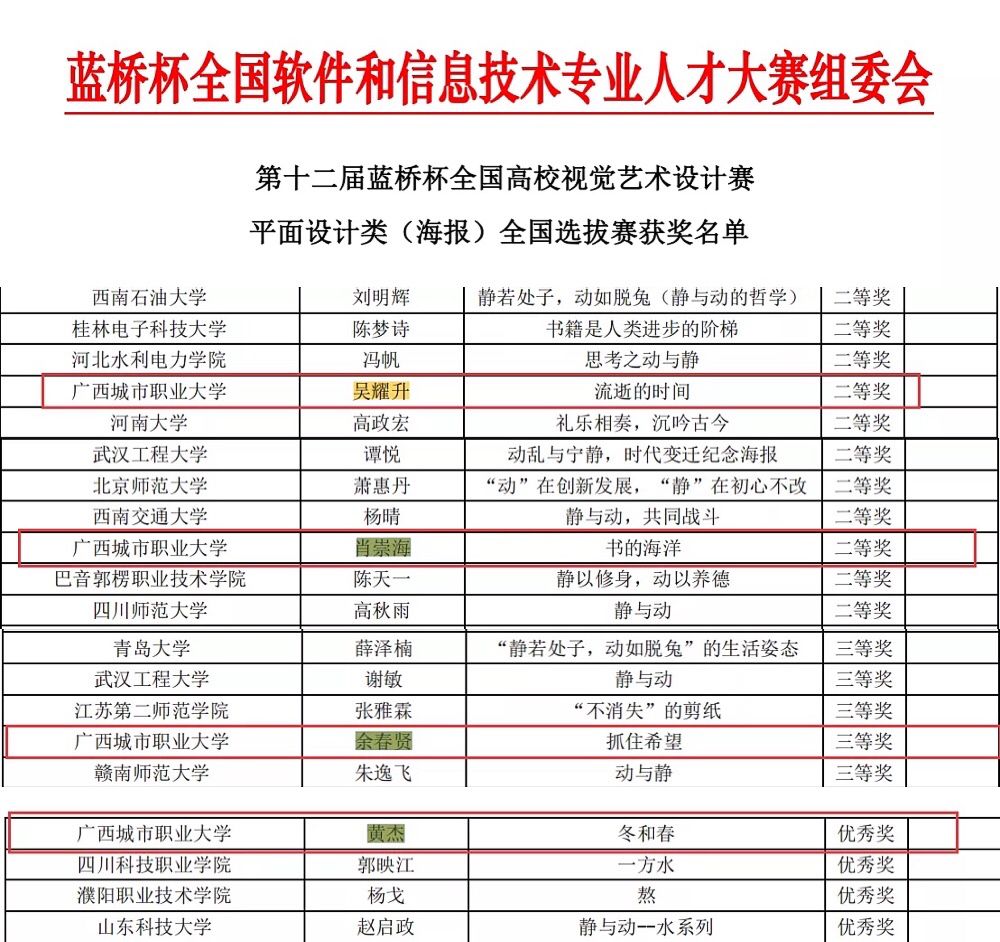其中,吴耀升同学的作品《流逝的时间》、肖崇海同学的作品《书的海洋》获平面设计(海报)类二等奖;余春贤同学的作品《抓住希望》获平面设计(海报)类三等奖;黄杰同学的作品《冬和春》获平面设计(海报)类优秀奖。