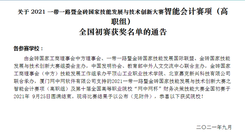 9月27日,商学院财务与会计专业(以下简称“财会”专业)代表队在2021“一带一路”暨金砖国家技能发展与技术创新大赛之智能会计赛项(高职组)中荣获全国初赛二等奖。