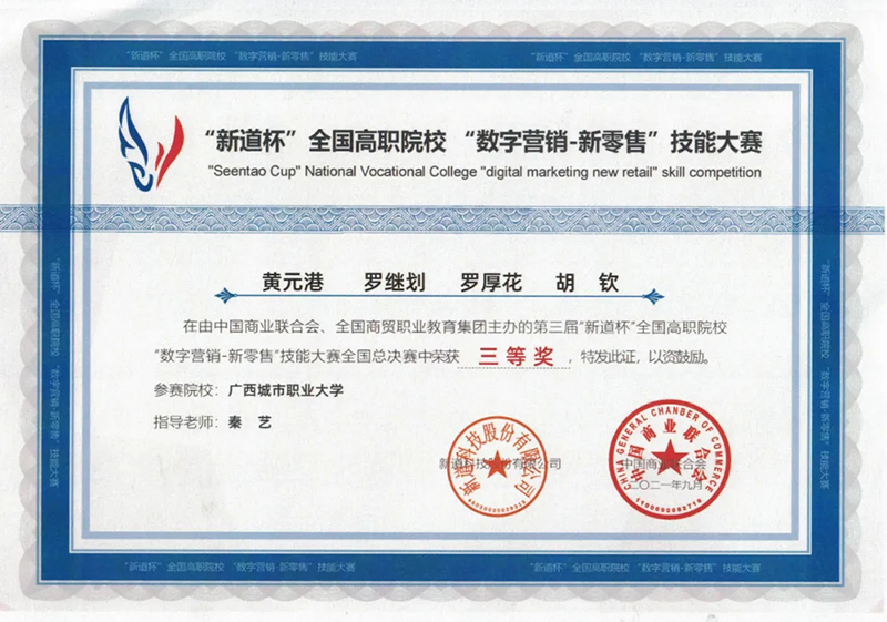 近日,第三届“新道杯”全国高职院校“数字营销-新零售”技能大赛顺利开展。商学院学子黄云港、罗继划、罗厚花、胡钦4名同学组成代表队参赛,在指导老师秦艺的带领下,凭借扎实的专业基础和稳定发挥,拼搏进取,取得了三等奖的好成绩。