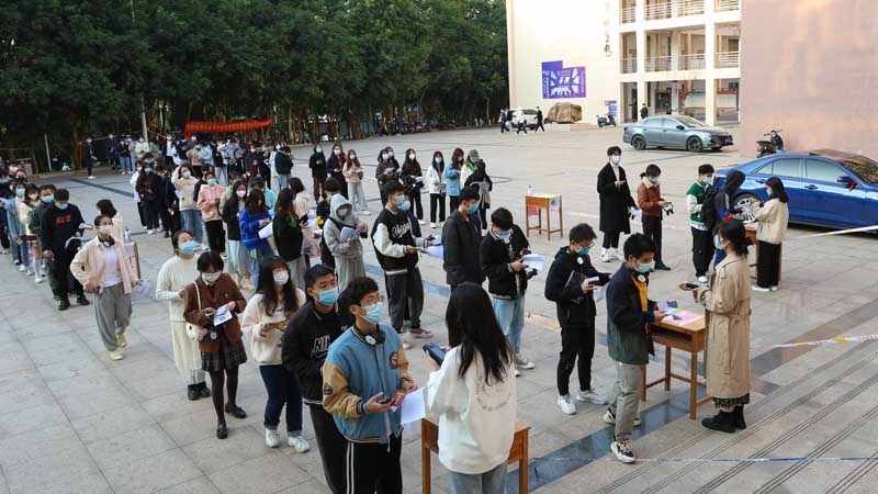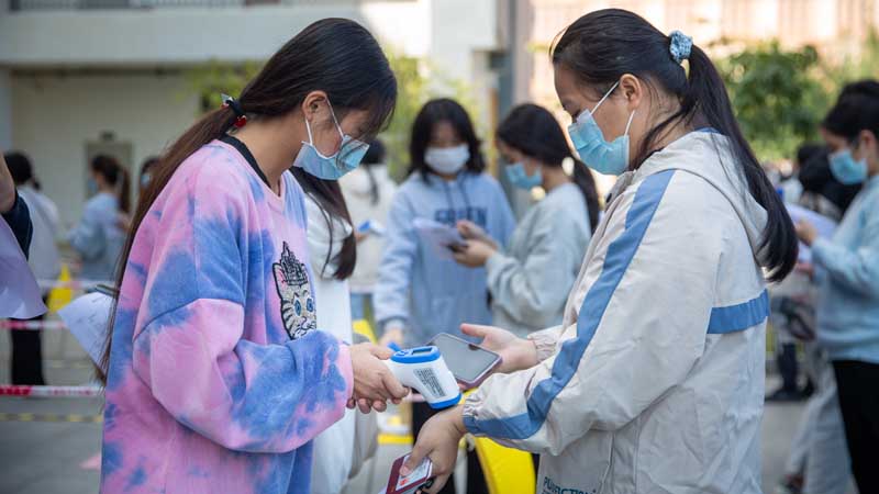 考试开始前半小时,考生在志愿者的协助下,出示绿色健康码、测量体温、验核个人信息、有序进入考场。