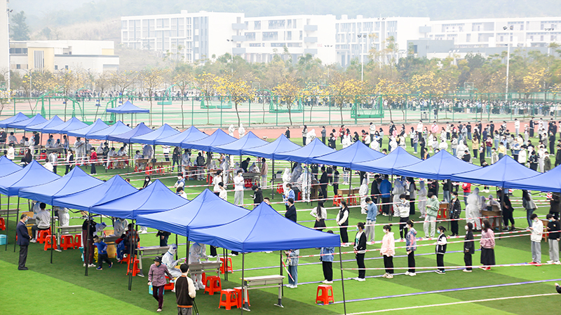 为保障全体师生生命健康和校园安全,按照学校疫情防控指挥部统筹部署,3月11日,崇左校区全体师生在田径场开展返校全员核酸检测工作。