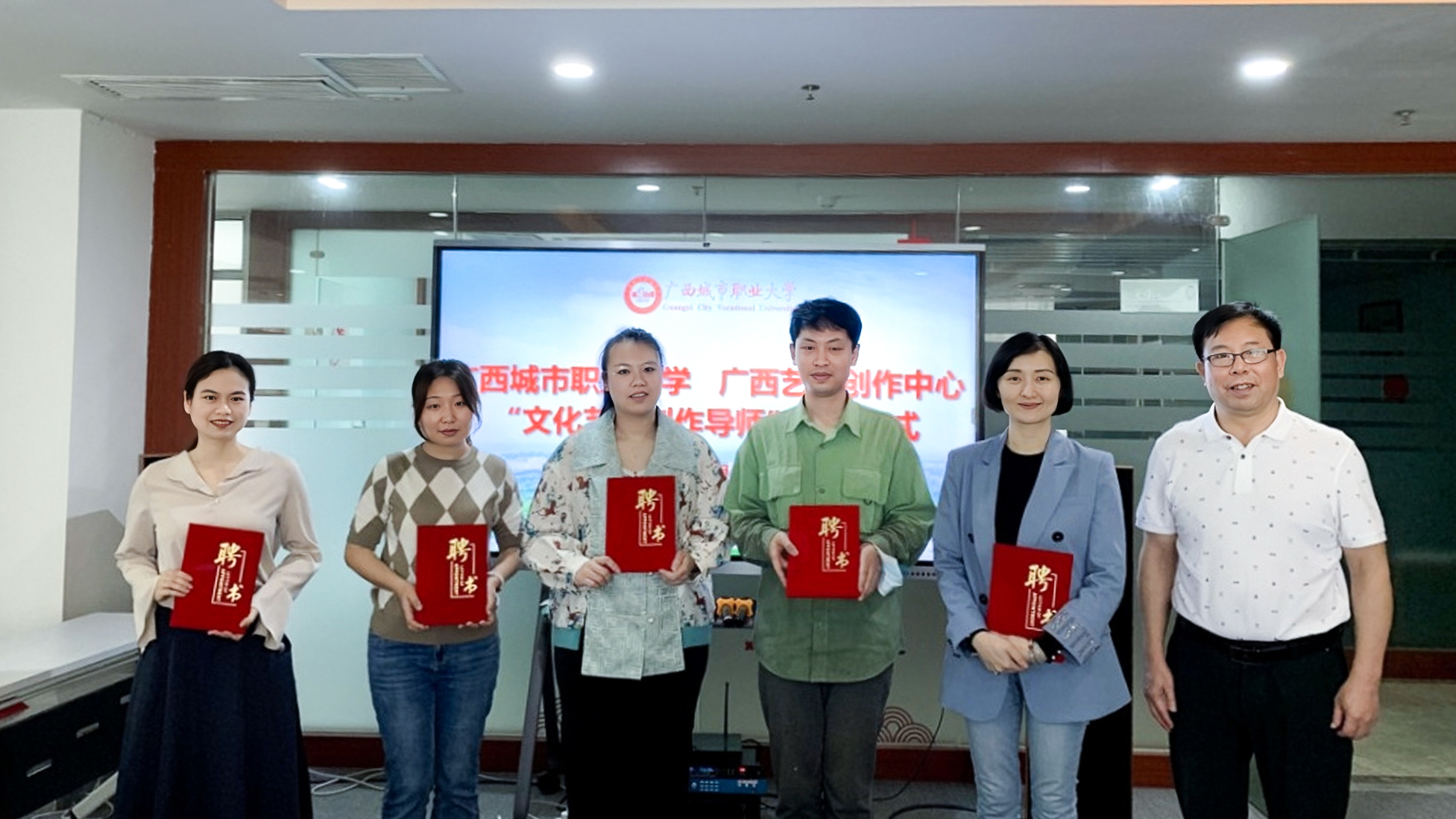 接着,在场与会领导、老师一同观看开云链接官网宣传视频,聘请广西艺术创作中心冯佳、黄露瑶、田原、饶秋芸、崔振蕾5位硕士为我校“文化艺术创作导师”,并为他们颁发“文化艺术创作导师”聘书。