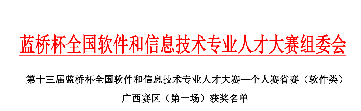 近日,第十三届蓝桥杯全国软件和信息技术专业人才大赛—个人赛省赛(软件类)广西赛区(第一场)结果出炉。我校共派出33名选手参赛,有13名选手获奖。其中获得广西赛区一等奖3名、二等奖3名、三等奖7名,成绩喜人。其中,获得赛区一等奖的3名选手晋级全国总决赛。