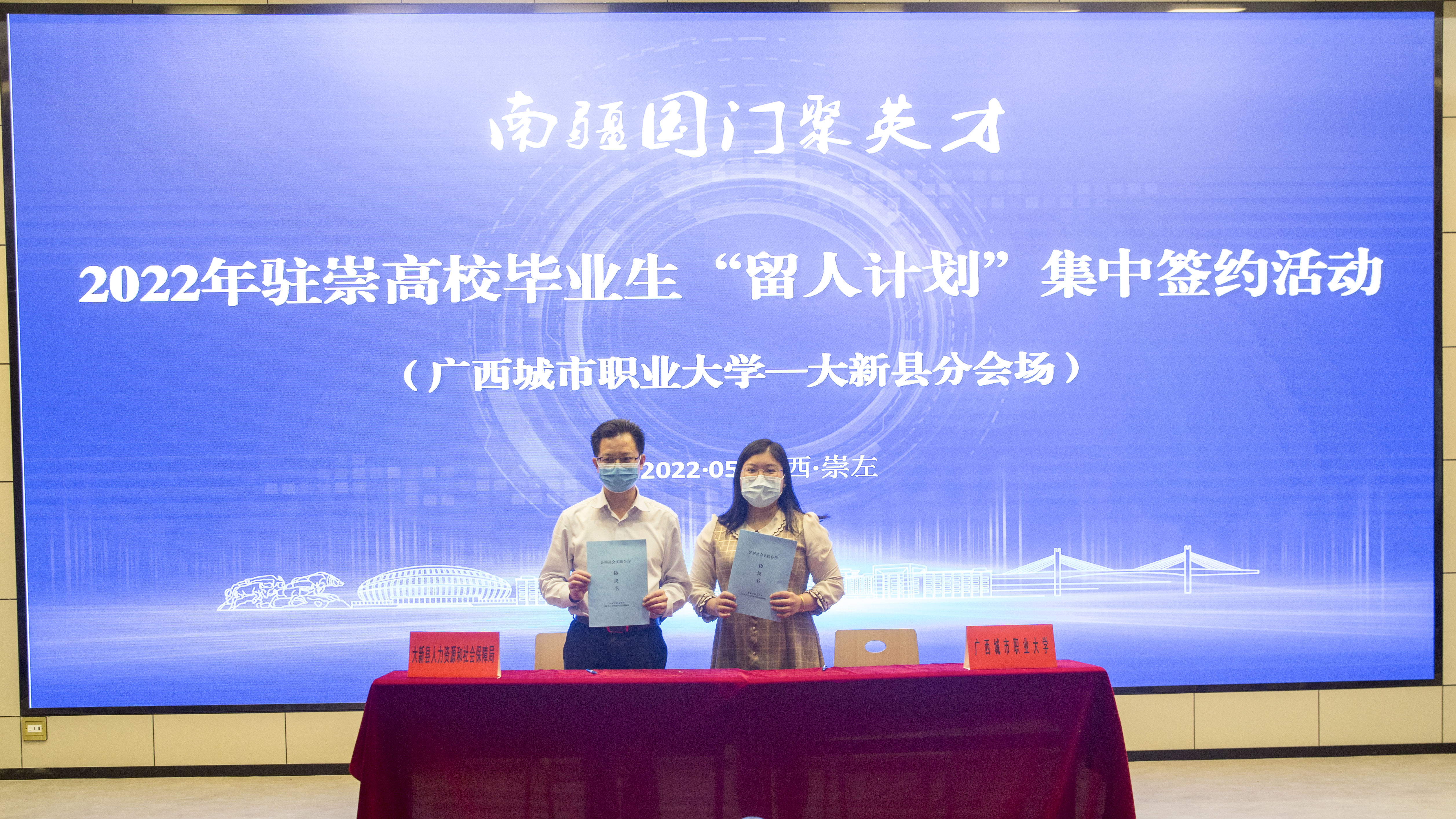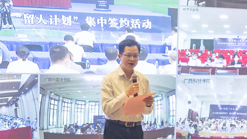 为深入实施“人才强市”战略,贯彻落实市委人才工作会议有关精神,持续深化“南疆国门聚英才”行动,加快推进崇左市“留人计划”任务落实落地,5月11日,我校在崇左校区15区报告厅设置2022年驻崇高校“留人计划”集中签约活动开云链接官网——大新县分会场。出席活动的有我校学工部(处)处长梁杭杭、崇左市人力资源和社会保障局副局长卢成苏、大新县人力资源和社会保障局局长农海仁、中共大新县委组织部副部长黄丽华,我校教育学院常务副院长莫婷婷等领导老师以及签约双方代表、我校师生代表等。