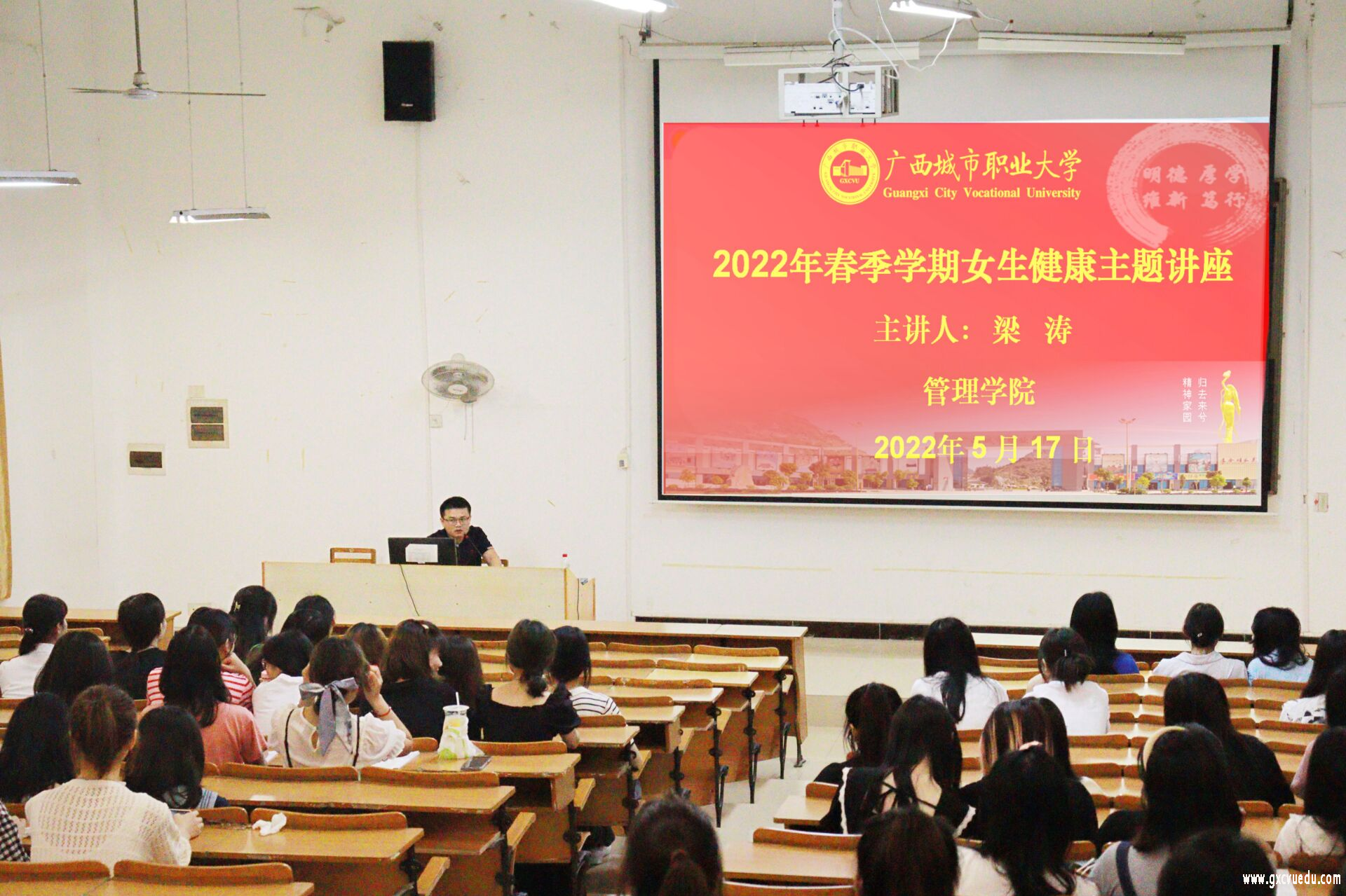 为进一步提升我校女生对预防女性疾病健康知识的认知,关爱女性,关注大学生健康发展,5月17日至19日,管理学院邀请扶绥县人民医院妇科主治医生滕婕、梁涛分别在阶梯五、阶梯六教室开展“美丽女生,拥抱健康”为主题的女性健康讲座。管理学院全体女生参加讲座。