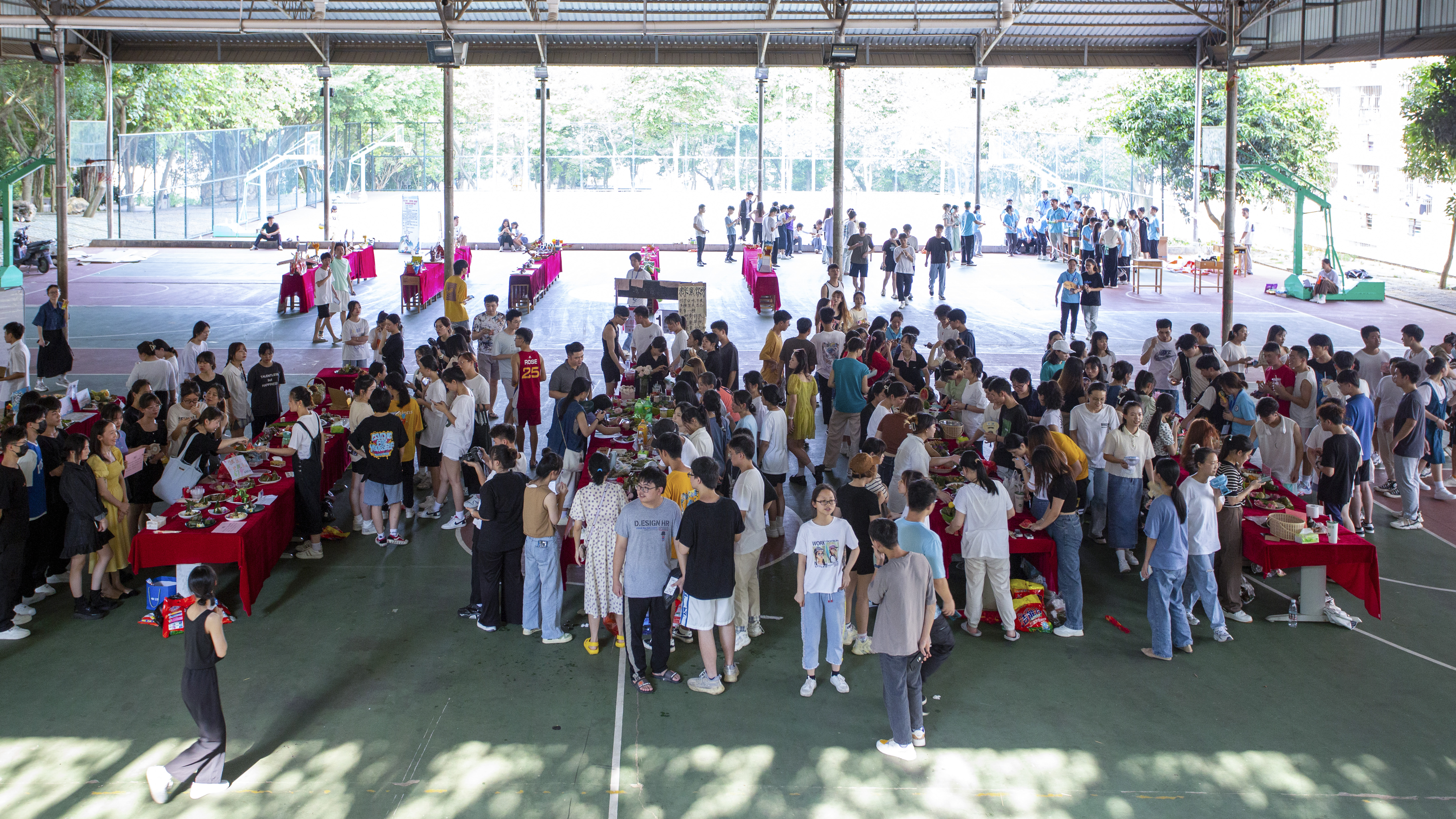 端午节当天,现场热闹非凡,比赛选手们热情高涨,同学们积极参与其中。在崇左校区食堂旁的篮球场上,棕香满溢。现场品尝的同学对选手们的粽子给予了高度的评价,他们表示在学校过了个不一样的端午节,即使没有回到自己的家里,也可以吃到软糯的粽子,感受家里的温暖。比赛队伍有“最美包粽队”“黄家团”“与粽不同队“等等,他们进行最终的比拼,选手们积极主动邀请同学们来品尝,为自己拉票。