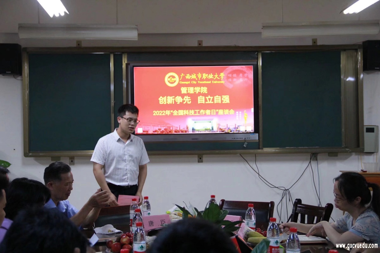 为深入学习贯彻习近平新时代中国特色社会主义思想,喜迎党的二十大胜利召开,深化拓展党史学习教育成果,团结引领广大科技工作者感恩奋进,加快建设现代化南疆国门城市不懈奋斗,管理学院于5月31日在四教4207会议室召开以“创新争先自立自强”为主题的科技工作者精神宣讲座谈会。管理学院党总支书记黄艳华、院长唐臣、副院长余冯蓬、梁秋萍等领导出席会议,全院教师参加会议。