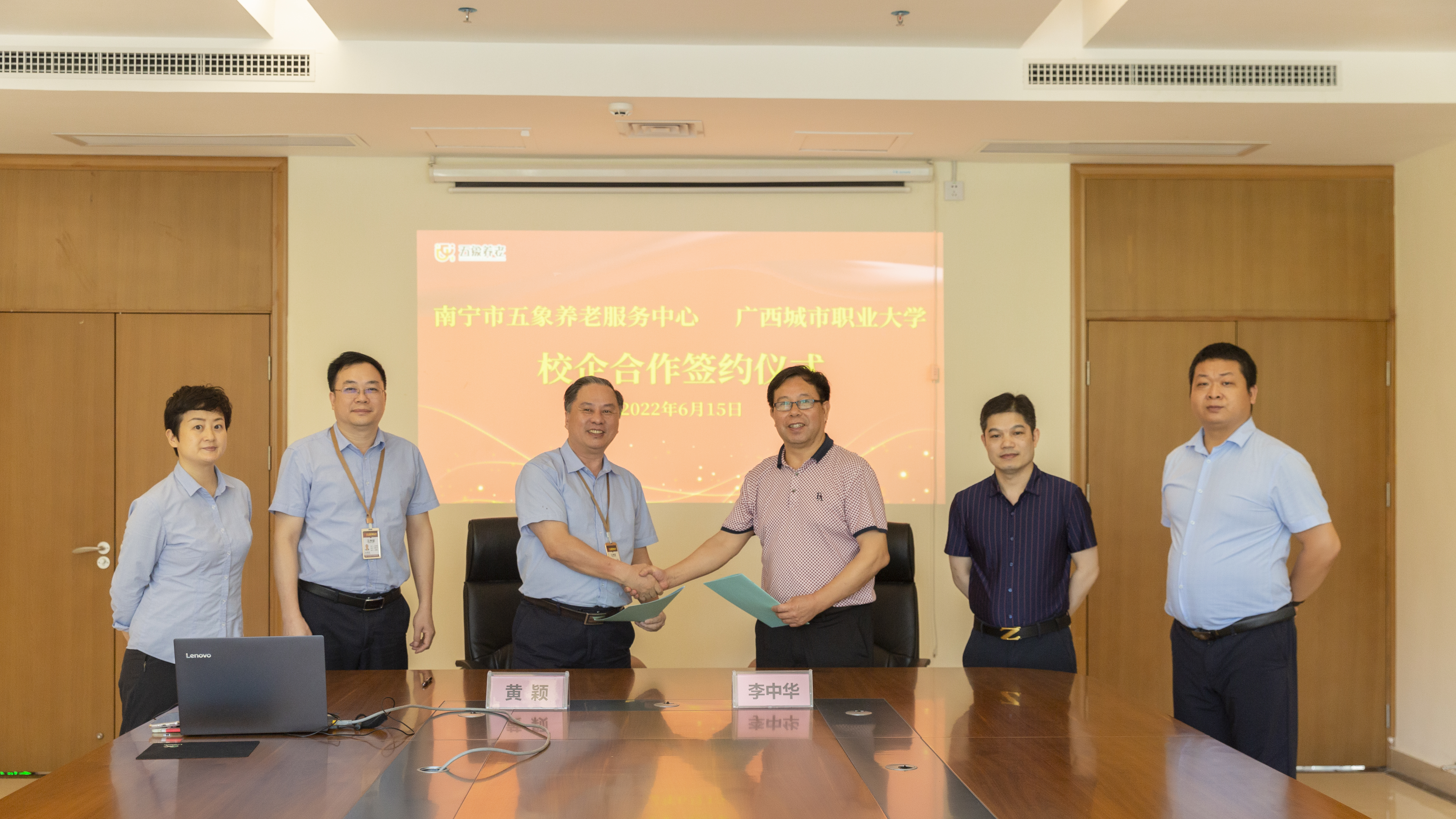 为进一步贯彻落实《国家职业教育改革实施方案》精神,深入推进职业教育产教融合校企合作,培养适应行业发展需求的复合型金融人才,6月15日,我校与南宁五象养老服务中心成功举行校企合作签约仪式,学校校长李中华、健康学院党总支书记杨朝义、五象养老服务中心主任黄颖、副主任吴明尚出席签约仪式。
