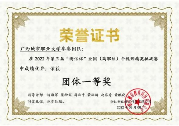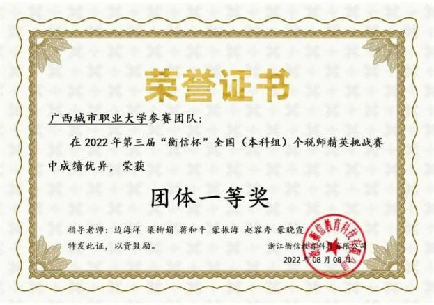 近日,由中国高等教育学会高等财经教育分会主办,浙江衡信教育科技有限公司提供技术支持的第三届“衡信杯”全国个税师精英挑战赛落下帷幕。我校商学院大数据与会计专业、大数据与财务管理专业的194名学生参加比赛,经过一个半月的精彩比拼,最终荣获本科组团体赛一等奖、高职组团体赛一等奖。我校入围全国百强本科人数共25人,其中刘莹莹、卢品伶同学皆获本科组个人现金奖一等奖,分别排名全国第二名、全国第三名。边海洋、梁柳娟、蒋和平、蒙振海、赵容秀、黄麒晓荣获“优秀指导老师”称号。