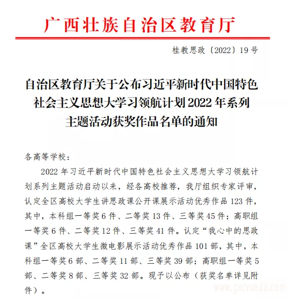 近日,根据《自治区教育厅关于公布习近平新时代中国特色社会主义思想大学习领航计划2022年系列主题活动获奖作品名单的通知》(桂教思政[2022]19号)悉知,由马克思主义学院何庆猷、唐超、蒙圣荣老师指导,建筑工程专业农岑诗同学主讲的思政课《爱国主义及其时代要求》荣获本科组三等奖。