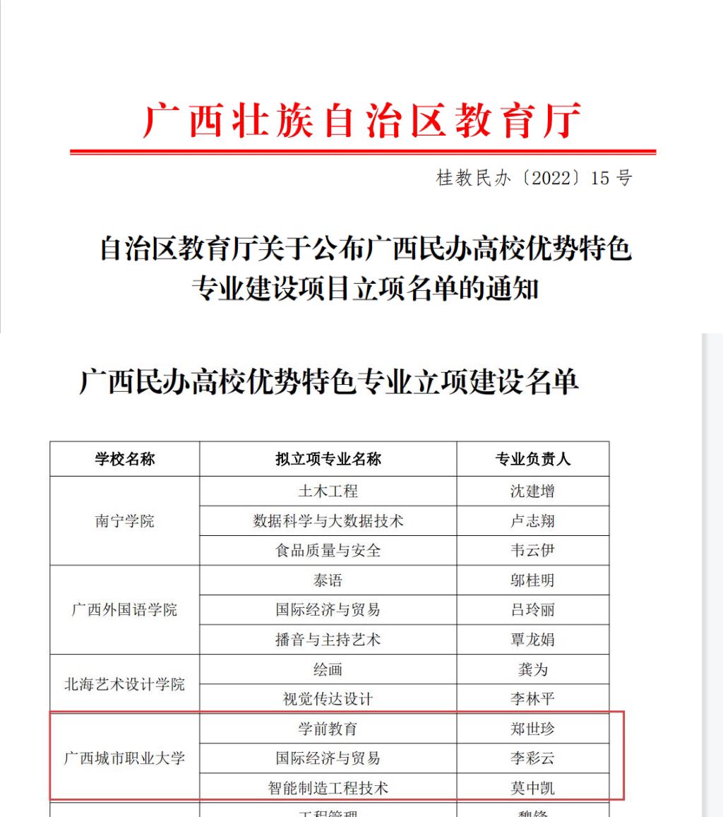 近日,自治区教育厅发布《自治区教育厅关于开展广西民办高校优势特色专业建设项目申报工作的通知》(桂教民办〔2022〕11号),我校学前教育、国际经济与贸易、智能制造工程技术3个职业本科专业获批广西民办高校优势特色专业建设项目。