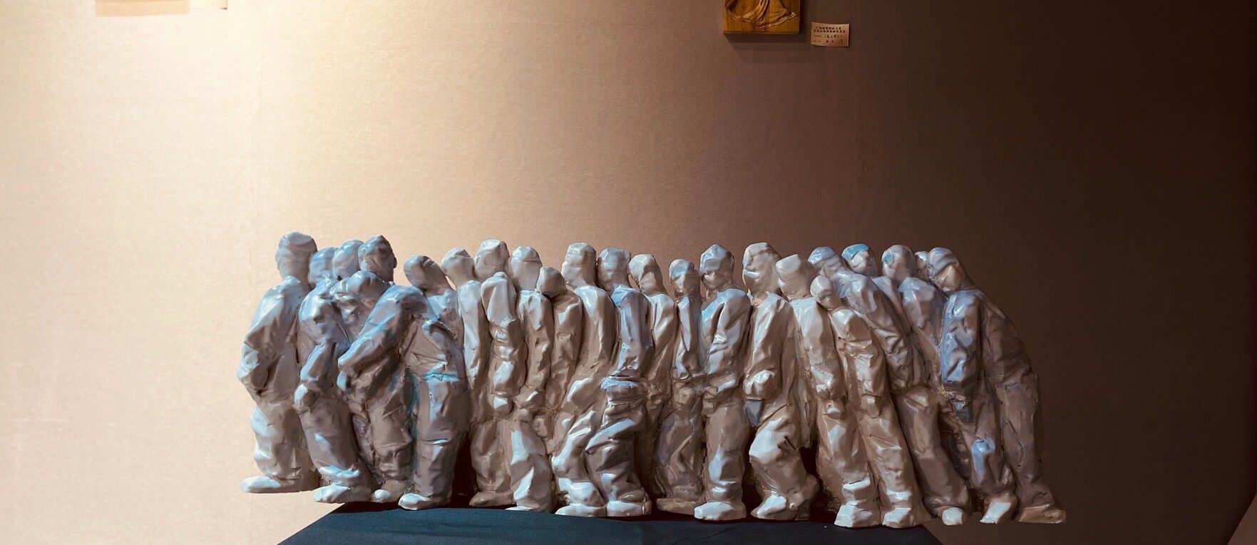 我校参赛教师的作品《护城河》是以陶瓷材料烧制而成,以新冠疫情为题材,作品采用大写意的创作手法,制作一字型排开穿着防护服的医务人员,表达了对抗疫时期医护人员和志愿者们辛劳付出的崇高敬意,他们挺身而出、甘于奉献的精神值得我们学习。