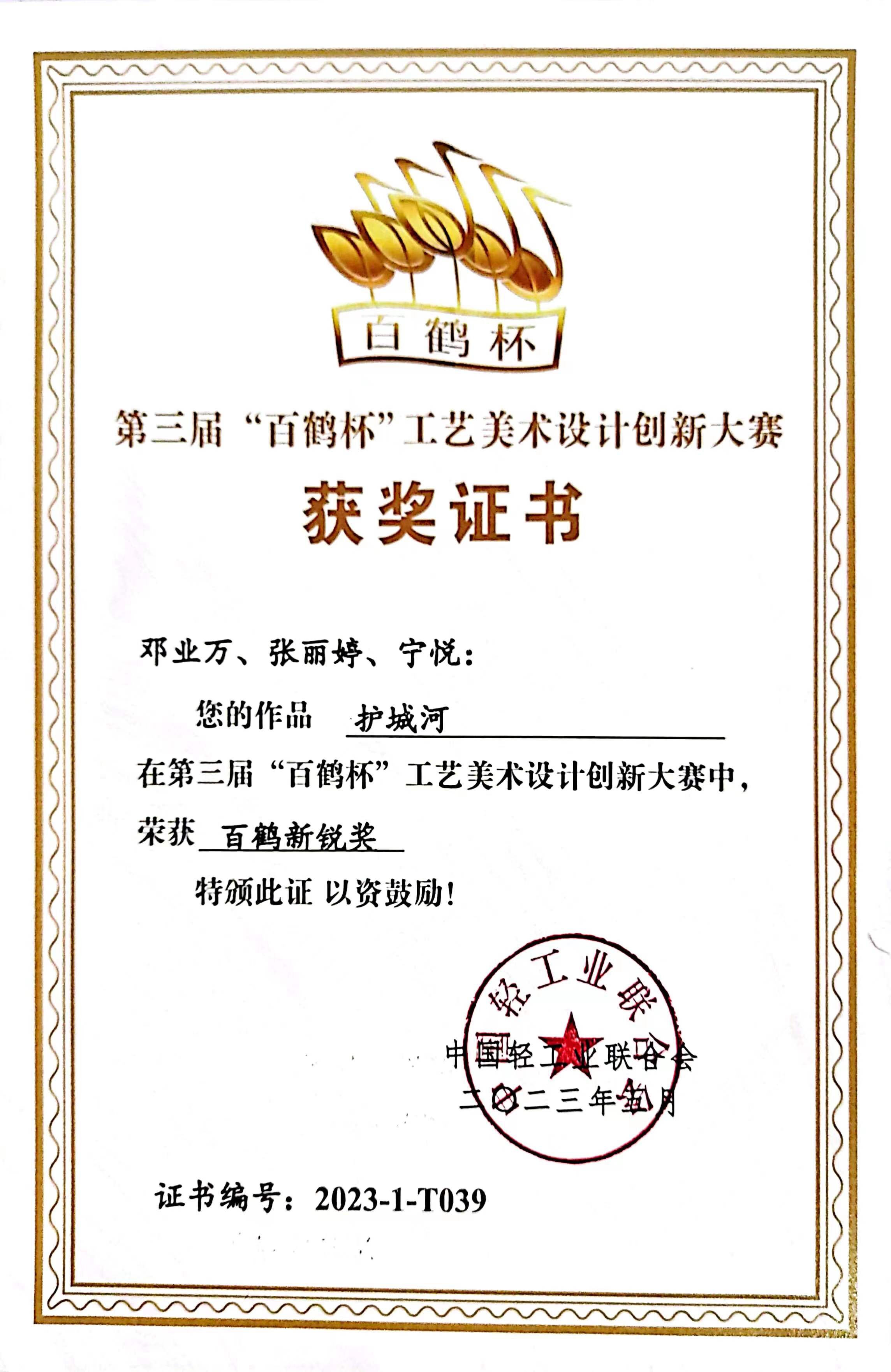 近日,我校艺术设计与文化传媒学院教师邓业万、张丽婷、宁悦的作品《护城河》参加第三届“百鹤杯”工艺美术设计创新大赛评比,喜获“百鹤新锐奖”奖项。