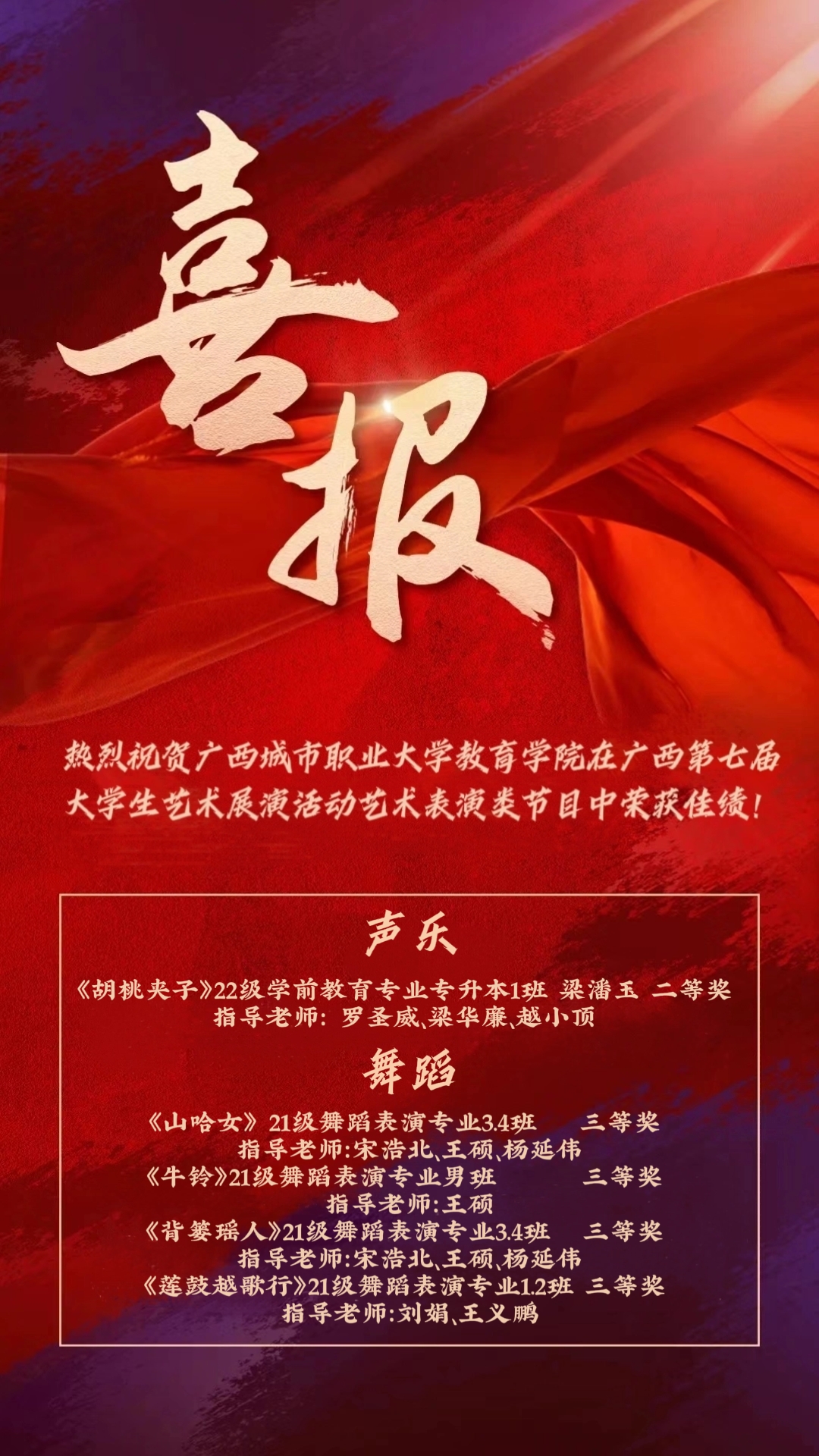 广西第七届大学生艺术展演活动由自治区教育厅主办,以“厚植家国情怀,涵养进取品格”为主题,坚持弘扬社会主义核心价值观,弘扬中华美育精神,坚持面向全体学生,以美育人、以文化人、以美润心、以美培元。教育学院学子佳绩耀眼,拿下“艺术表演类节目”组二等奖1项,三等奖4项。