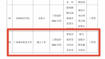 《广西大学生BIM应用技能大赛》中取得优异成绩,该竞赛赛是由广西教育厅主办,北部湾大学承办的区级竞赛,经过激烈的角逐,我院学子最终斩获工程造价赛项三等奖。